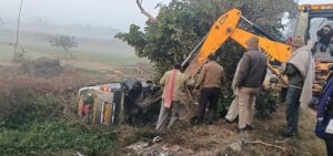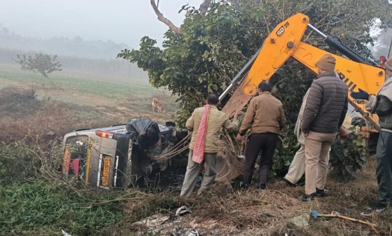 अज्ञात ट्रैक्टर टोली की टक्कर लगने से कार सड़क किनारे गड्ढे में पलटी