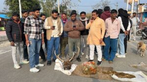 बजरंग दल के कार्यकर्ताओं ने मौके पर पहुंचकर हिरण का सिर एवं खाल शाकंभरी मार्ग पर रखकर किया जोरदार प्रदर्शन  वन क्षेत्राधिकारी के खिलाफ भी की जमकर नारेबाजी